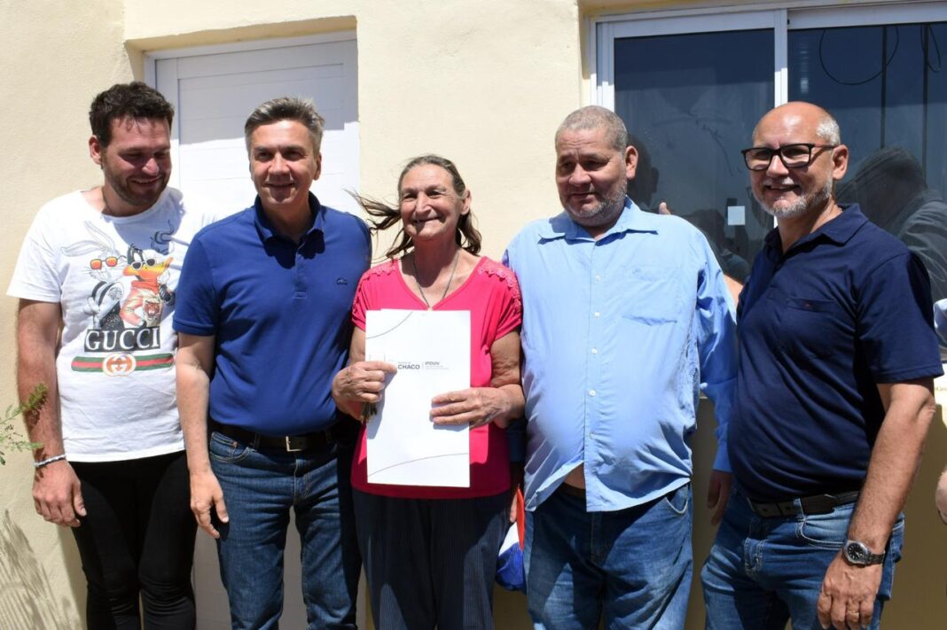 “Recuperamos las viviendas para que sean hogares, y vivan las familias. Trabajamos para que los recursos de los chaqueños lleguen a las manos de los chaqueños”, expresó el primer mandatario provincial, acompañado por el presidente del IPDUV, Fernando Berecoechea; y los vocales Diego Gutiérrez y Daniel Monti; Concejales; Lorena Kaenel de Ñachec; Julio Fantín, subsecretario de Agricultura; y Rubén Custiniano, de Sameep.
