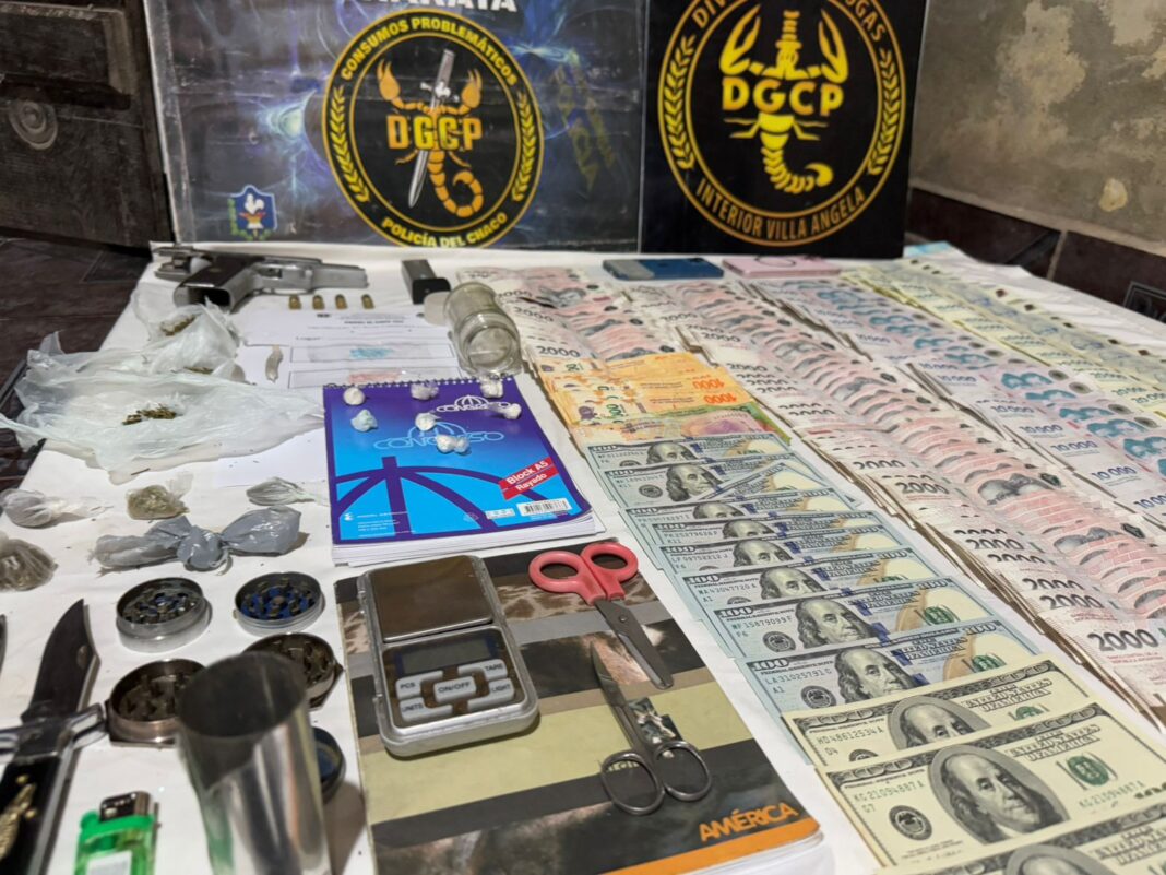 Desde las 14:30 hasta las 20:20 de hoy, los agentes de la división Operaciones Drogas Interior Villa Ángela realizaron dos allanamientos para culminar con una investigación de venta y distribución de estupefacientes en la localidad. Como resultado de los operativos tres personas fueron detenidas y se incautó cocaína, marihuana, dólares, pesos y varios elementos probatorios de una presunta comercialización de estupefacientes.