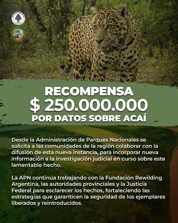 Tras la desaparición de la yaguareté Acaí en El Impenetrable, Chaco, la Administración de Parques Nacionales (APN) ahora ofrece una recompensa de $250 millones para quienes aporten información sobre el caso.