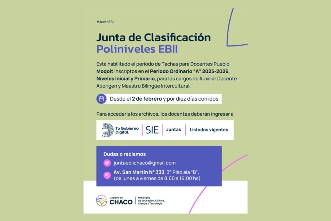 El Ministerio de Educación, a través de la Junta de Clasificación Poliniveles para la Educación Bilingüe Intercultural Indígena por la comunidad Moqoit, informó a los docentes inscriptos en el Período Ordinario “A” 2025-2026, de los niveles inicial y primario, que desde el 2 de febrero y por el término de 10 días corridos se encuentra habilitado el período de Tachas.
